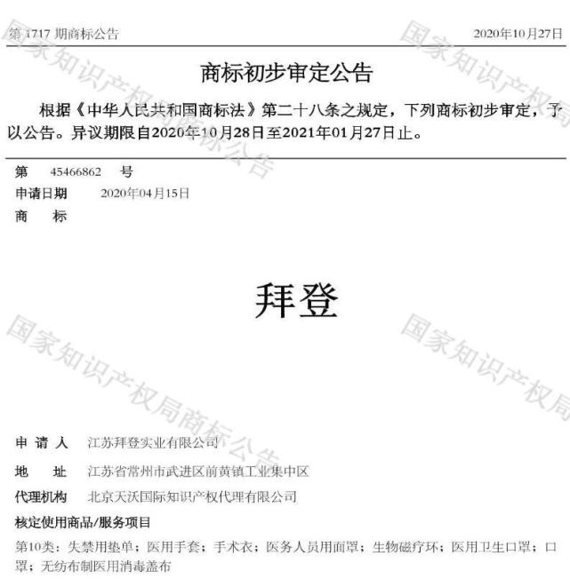 近日,热闹非凡的美国大选基本“拜”局已定,根据各个州所公布的统计结果,拜登获得290票,已超过了当选总统所需的270票。就在此前不久,在国家知识产权局中国商标网的第1717期商标公告中,惊现了“拜登”商标的申请,申请人显示为江苏拜登实业有限公司。从商标公告来看,核定使用商品和服务项目包括失禁用垫单,医用手套,手术衣,医务人员用面罩等医疗用品。 原作者: 来 源: 金融界网站 共有142位读者阅读过此文