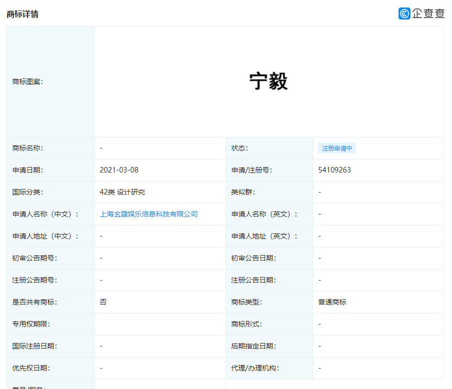 企查查APP显示,起点中文网关联公司上海玄霆娱乐信息科技有限公司于3月8日申请注册“宁毅”、“苏檀儿”、“耿护院”等姓名商标,涉分类第41类教育娱乐,42类设计研究等。据悉宁毅、苏檀儿皆为小说及改编电视剧《赘婿》的人物形象,商标状态为注册申请中。