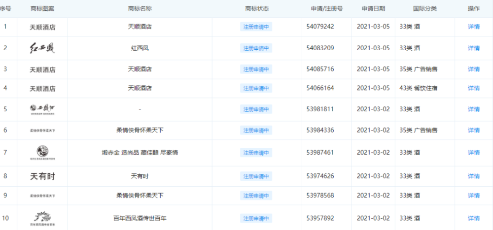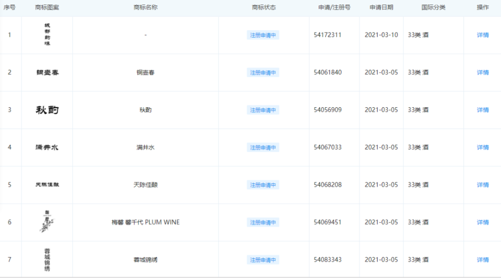 据企查查APP上的检索结果显示,四川水井坊股份有限公司于三月集中申请注册了包括“秋酌”、“满井水”、“天陈佳酿”在内的数个新的商标,而其新注册的商标国际分类也都是相同的33—酒类商标。