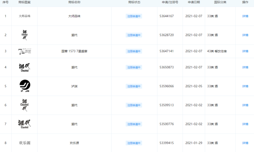 无独有偶, 通过企查查APP上可以看到,泸州老窖股份有限公司,也早已于1月开始,就陆续申请注册了包括“潮代”、“泸渊”、“大师品味”在内的多个国际分类同样为33—酒类的商标。